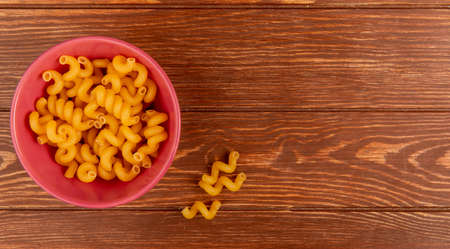 top view of fusilli pasta in bowl on wooden background with copy space