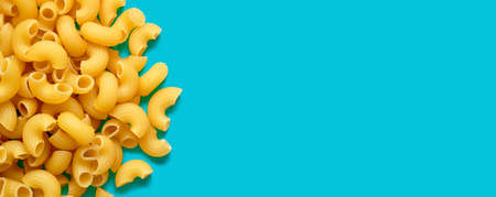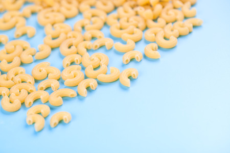 Macaroni Pasta on Blue Background, Copy Space for Text, Food Background Concept.