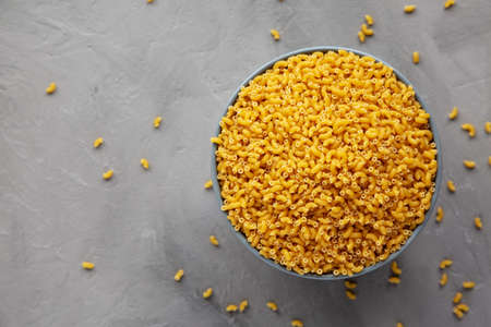 Dry Organic Pasta Coquillettes in a Bowl, top view. Flat lay, overhead, from above. copyspace.