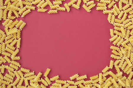 Spiral pasta scattered on a dark pink and light pink background