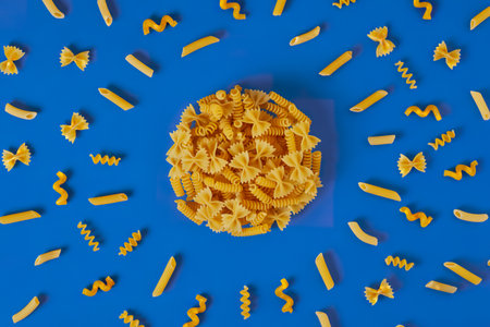 top view of macaronis as farfalle fusilli penne set in round shape on blue background with copy space