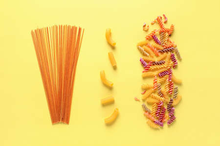 Assortment of dry pasta on color background