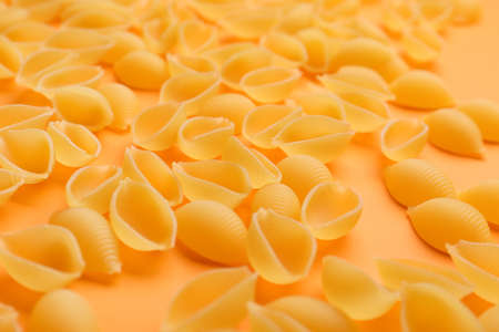 Uncooked conchiglioni pasta on color background