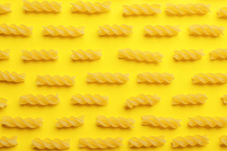Uncooked fusilli pasta on color background