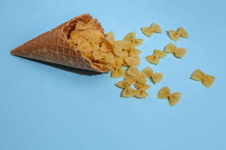 Ice cream waffle cone with pasta bows on blue pastel background