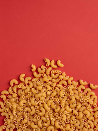 Uncooked macaroni pasta on red background. Top view.