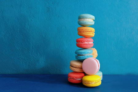 Colorful macaroons on blue background. Sweet macarons. generative ai