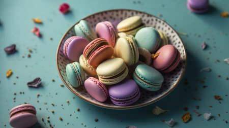 Colorful macarons and fresh blueberries arranged on a plate, highlighting the delicate and sweet nature of these popular French pastries, perfect for dessert themes.