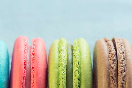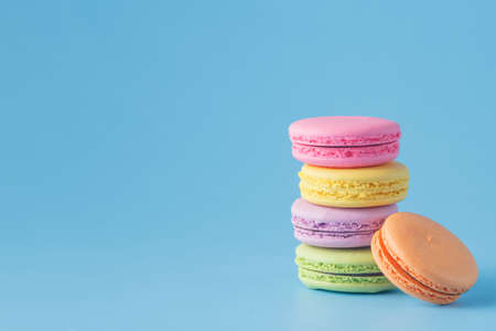 Beautiful and delicious macaroons. French sweets. Different cakes of delicate shades on a blue background, free space on the left