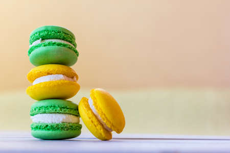 Colorful abstract background with traditional french macaroons cookies, over yellow background with copy space for text.