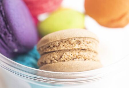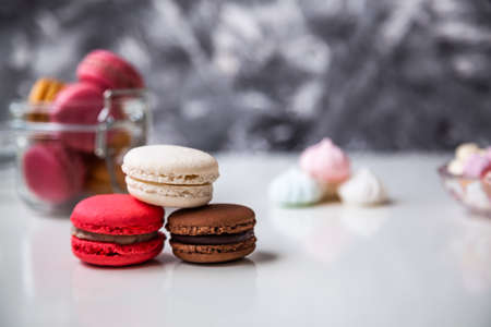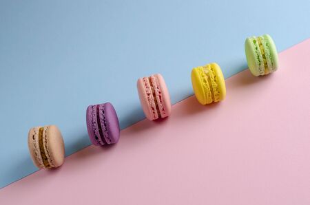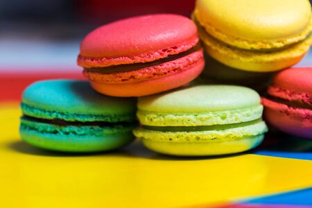 Colorful macarons cakes. Small French cakes. Sweet and colorful french macaroons, colorful almond cookies, pastel colors