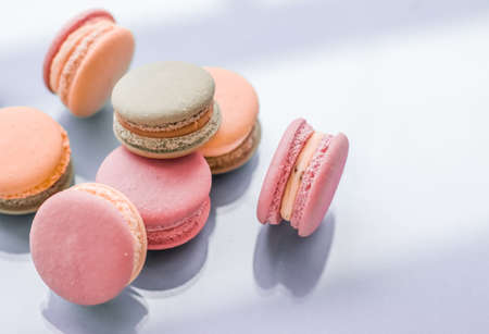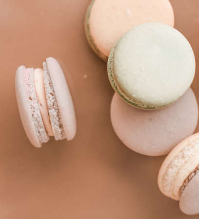 Pastry, bakery and branding concept - French macaroons on cream beige background, parisian chic cafe dessert, sweet food and cake macaron for luxury confectionery brand, holiday backdrop design