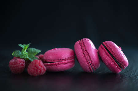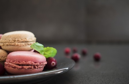 French dessert. Sweet pink macaroons or macarons with cranberry dark background. copy space