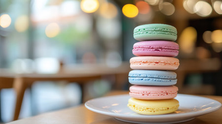 Colorful macarons stacked on a plate highlighting various flavors in a cozy cafe setting