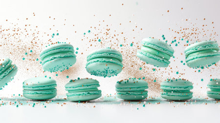 group of cyan macarons float in mid-air, surrounded by a cloud of sprinkles, creating a whimsical and festive atmosphere.