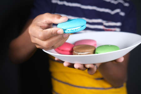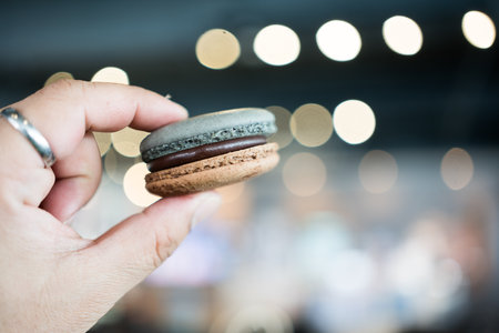 Macarons sweet chocolate on man hand perfect for dessert lovers.