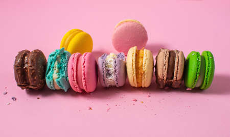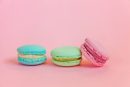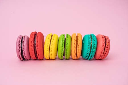 Bright colorful various flavor macarons sweet cookies on pink background.