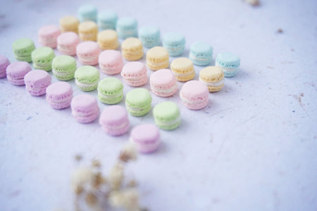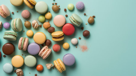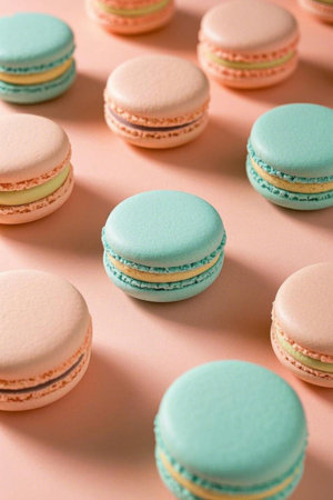 A delightful arrangement of pastel-colored macarons on a light blue backdrop.