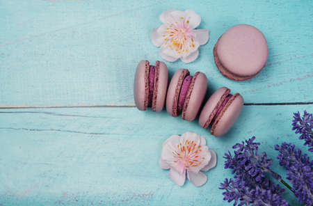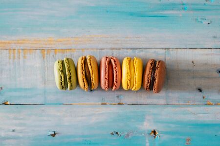 Coloured macarones biscuits on a blue wooden table background - concept of bakery and party lifestyle with sweet snacks - food decorations viewed from above with creak and chocolate