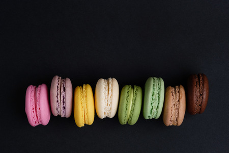Gourmet dessert of French macarons on dark background. Copy space. Selective focus.