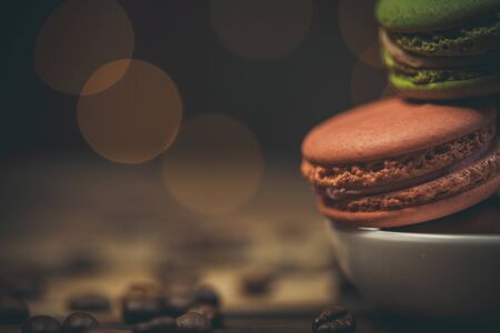 Tasty macaroon cookies with coffee on a wooden table in warm color with beautiful bokeh