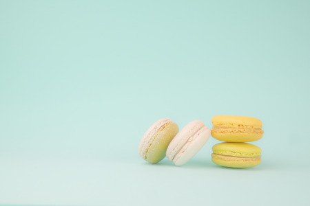 Cake macaron close up on yellow background flavor almond cookies pastel colors