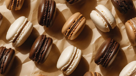 White and dark macarons with creamy ganache filling, placed on a brown paper surface. Hard light creates sharp shadows for a modern minimalist aesthetic. Top view, ample copy space.