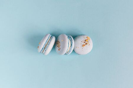 Tasty french macaroons on a light blue pastel background. Flat lay. Place for text.