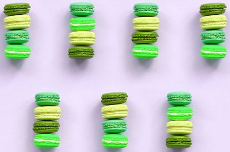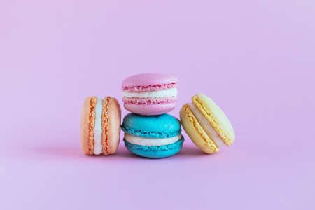 Dessert cake macaron or macaroon on trendy pastel lilac background top view. Flat lay composition.