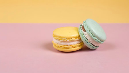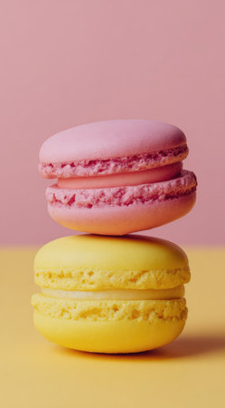 Two vibrant macarons are stacked atop each other, set against a two-tone background. The top macaron is pink, and the bottom one is yellow. The composition showcases smooth textures and strong color contrasts. Suitable for food blogs, confectionery advertising, and general commercial use.
