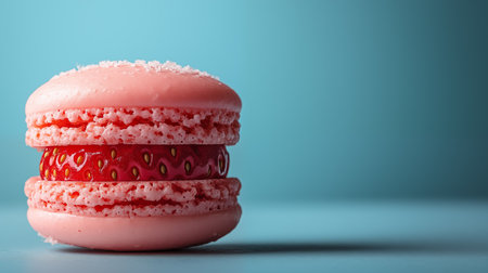 A delightful arrangement of colorful macarons on a plate contrasts beautifully against a soft pink background, perfect for culinary illustrations and dessert themes.