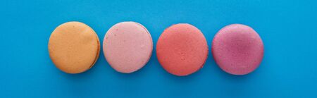 flat lay with colorful delicious French macaroons on blue bright background, panoramic shot