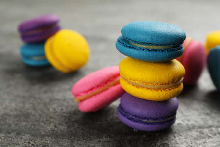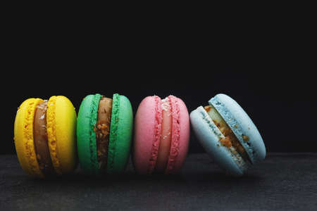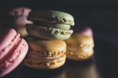 Colorful multicolor sweet delicious macaroons on dark background. Shallow depth of field. Coloring toned photo.