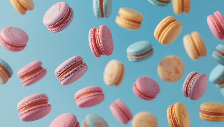Delicious macarons in various flavors and colors are suspended in the air, creating a fun and vibrant scene that highlights these popular French sweets.