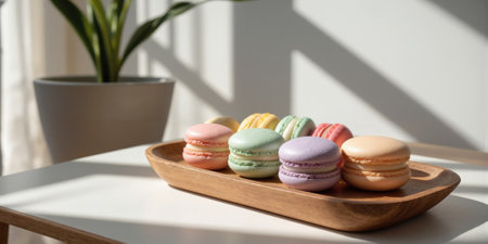 A small, wooden tray holding an assortment of colorful macarons in various pastel hues-pink, lavender, mint green, and peach-each