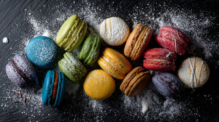 A vibrant collection of macarons arranged artfully on a dark slate surface, lightly dusted with powdered sugar, capturing the essence of delightful pastries and gourmet treats.