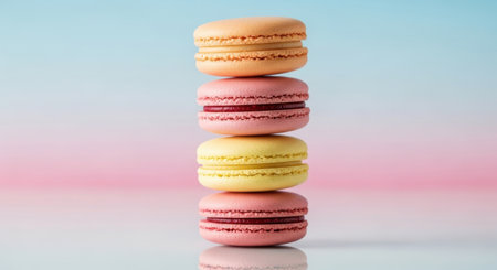 Four colorful French macarons are neatly stacked, showcasing their delicate shells and sweet fillings.