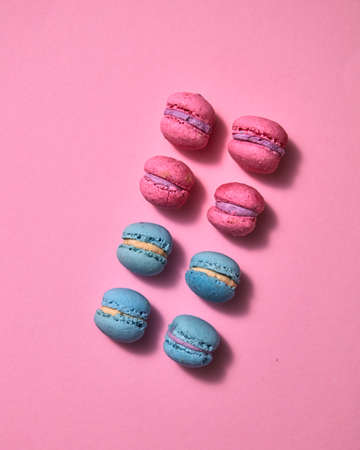 Bright colorful various flavor macarons sweet cookies on pink background.