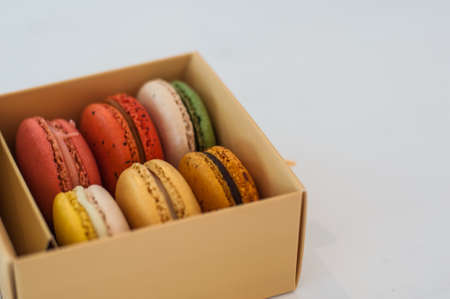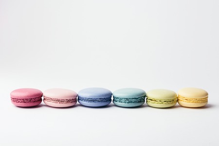 Colorful macarons cakes. Small French cakes. Sweet and colorful french macaroons, colorful almond cookies, pastel colors