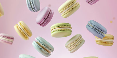 Delicious macarons in various flavors and colors are suspended in the air, creating a fun and vibrant scene that highlights these popular French sweets.