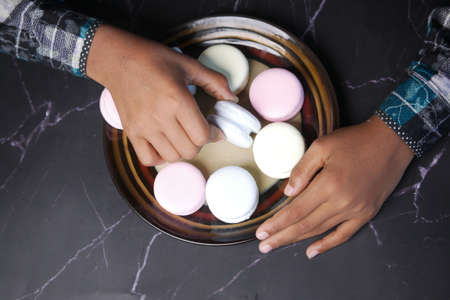 Sweet colorful macarons. Traditional french macaroons. Tasty dessert on black table. Top view.