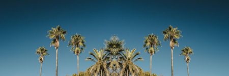 perspective of many palm trees against a blue sky