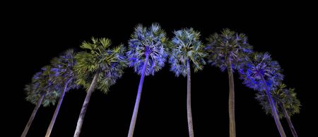 An iamge of sugar palm trees that shining with the light of LED lamps in the night.