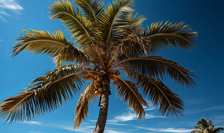 Palm leaves stretch towards the bright blue sky, showcasing vibrant greens and gentle white clouds drifting by, creating a serene tropical atmosphere. Generative AI.
