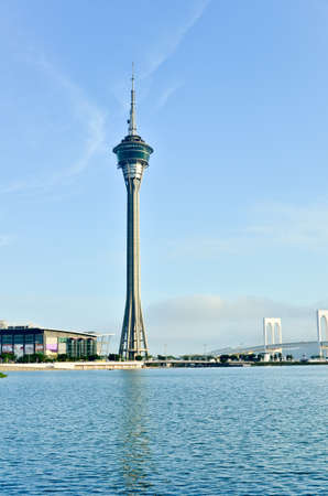 Sunny view of the famous Macau tower at Sai Van Lake, Macau, China