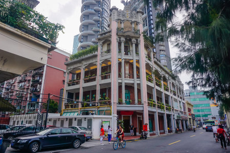 Guangzhou, China- 6 Jun 2024: Old European style building at the corner of a street in Shamian island. This tiny island is used to be a prosperous foreign enclave, it owns many exotic buildings.