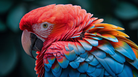 beautiful Scarlet macaw parrot close up portrait on dark background