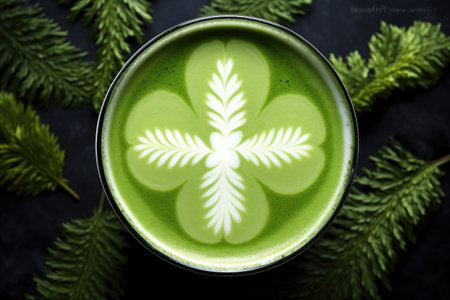 A serene close-up of green tea in a ceramic bowl surrounded by vibrant green leaves, creating a natural and refreshing atmosphere. Perfect for wellness and relaxation themes.