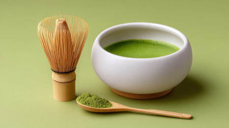 A visually appealing scene featuring matcha green tea with a traditional whisk and spoon. Emphasizes minimalist design and natural elements.