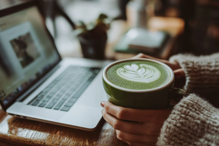 Artful Swirls of Freshly Brewed Matcha Latte in Handmade Ceramic Cup
